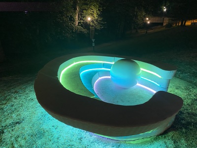 Pearl of the Wabash is a public art sculpture in Tapawingo Park that celebrates the Wabash River and the community’s deep connection to it. Created through a three-year Public Artist in Residence collaboration with the City of West Lafayette, IN, the project was shaped by community engagement, public events, and surveys. Partnerships with the Wabash River Enhancement Corporation and participation in water quality research, including the Wabash Sampling Blitz, informed the design. Centered on the freshwater mussel, a vital but endangered natural water filter, the sculpture uses three interlocking rings and color animation to visualize over 4,500 water quality datapoints from 2012 onward.